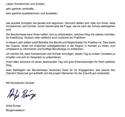 Ich freue mich sehr, dass die Berufsmesse in Oberursel stattfindet und wünsche Ihnen einen schönen, informativen und erfolgreichen Ausbildungstag.